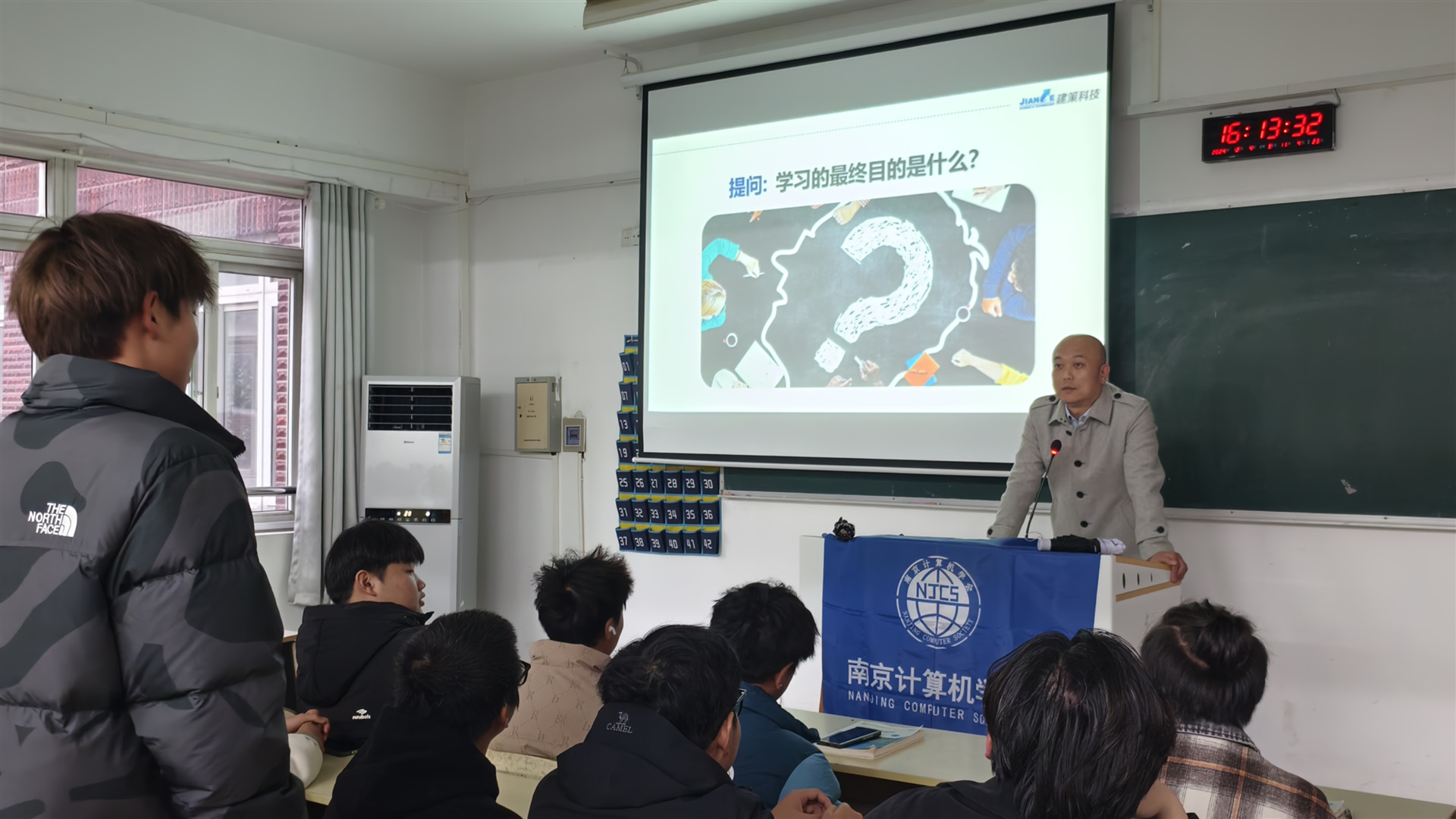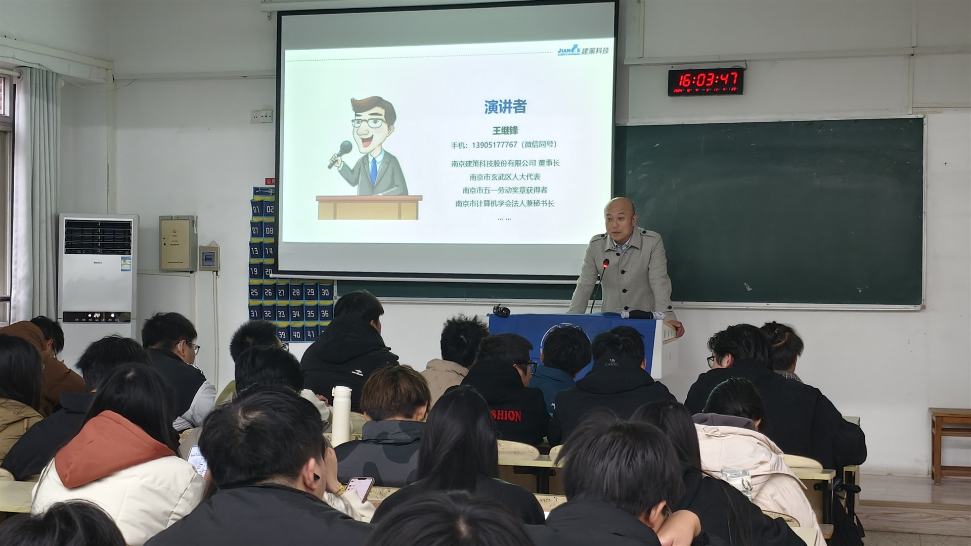 12月4日下午,电子与信息技术系邀请南京建策科技股份有限公司董事长王继锋为av在线 2024级计算机网络技术专业建策订单班学生举办了一场精彩的职业生涯规划专题讲座,讲座由计算机网络技术专业负责人张韬主持。
