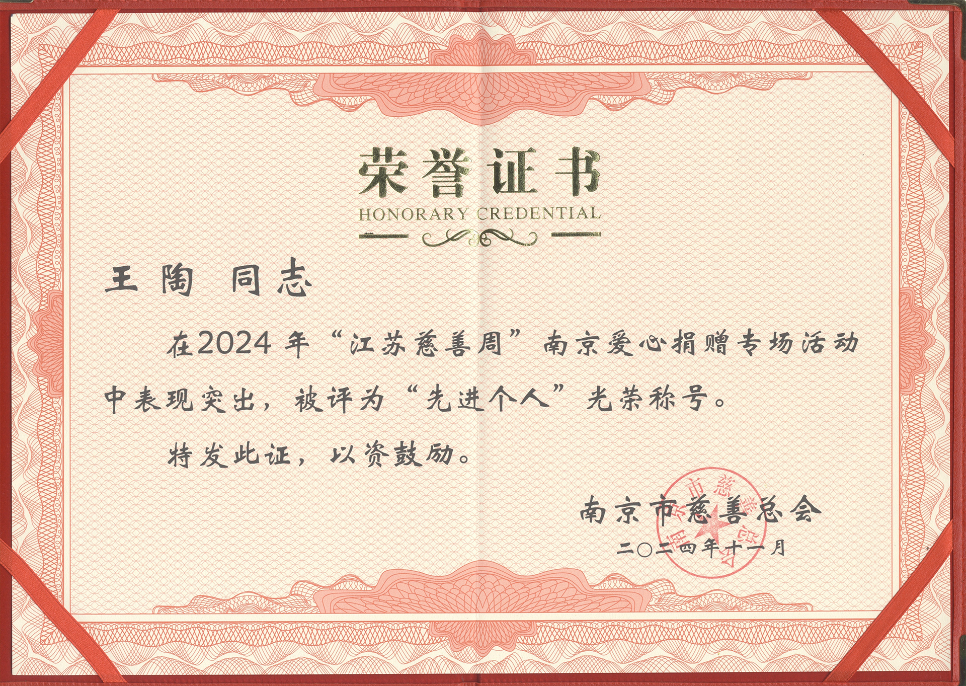 近日,南京市慈善总会召开2024年“江苏慈善周”南京爱心捐赠专场活动总结表彰大会,市慈善总会、市民政局领导出席会议,各区慈善总会(协会、分会)、网络募捐、公益合作单位负责人等约80人参会。会上,表彰了一批先进单位和优秀个人。艺术设计与建筑工程系教师王陶被授予“先进个人”荣誉。