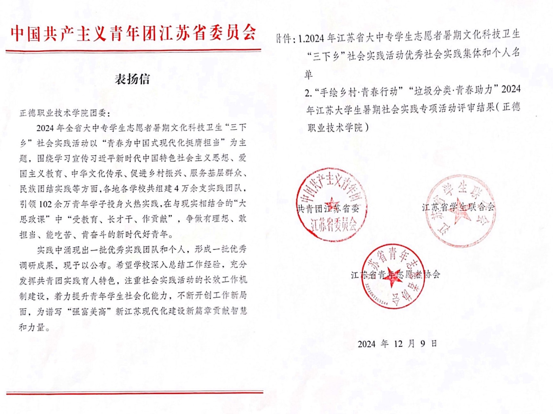 院团委荣获2024年江苏省“三下乡”社会实践活动优秀组织单位;电子与信息技术系“青春筑梦,红色传承”实践团、艺术设计与建筑工程系“创‘艺’青春,绘建乡村”实践团荣获2024年江苏省“三下乡”社会实践活动优秀实践团队;艺术设计与建筑工程系辅导员魏玮老师荣获2024年江苏省“三下乡”社会实践活动优秀指导教师;经济与管理系《数字赋能振乡村 惠农兴乡促发展——关于直播技术在农业现代化与乡村振兴中的价值、成效及发展的调查研究》、基础教育系《关于红色革命精神在当代儿童青少年中的传承现状与创新途径——<革命薪火>的调研报告》荣获2024年江苏省“三下乡”社会实践活动优秀调研报告;经济与管理系刘香玉同学、艺术设计与建筑工程系周奕同学、汽车与机电工程系李雨欣同学荣获2024年江苏省“三下乡”优秀实践个人。