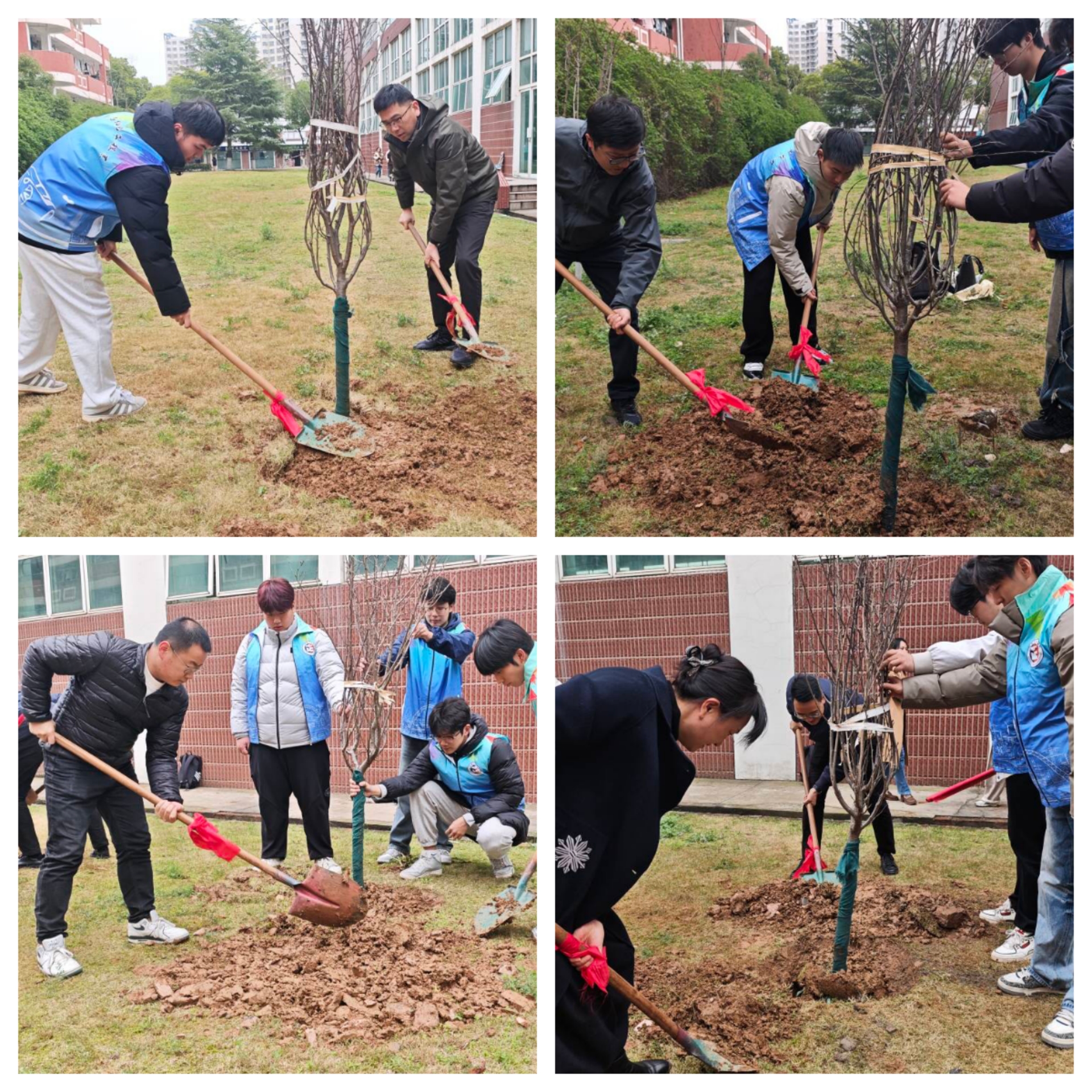 活动伊始,师生们分组协作,投入到植树行动中,志愿者在一旁协助。有的挥锹铲土,有的小心翼翼扶正树苗,还有的往返提水浇灌,在此过程中展现了师生们良好的协作能力。在大家的齐心协力下,一棵棵承载着毕业生感恩之情的树苗被稳稳种下,并为树苗们挂上属于自己的名片。同学们通过为校园增添一抹新绿,表达了对学院最真挚的祝愿,愿学院的未来如这一棵棵树苗般茁壮成长,稳步前行。