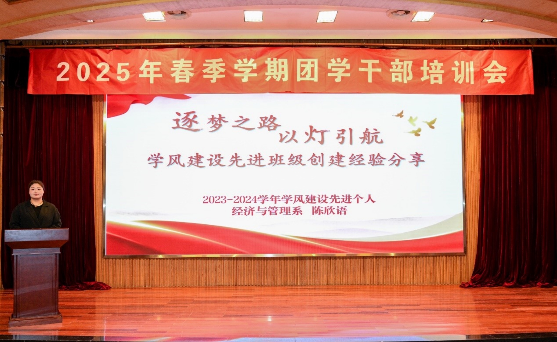 会上,学院2023-2024学年学风建设先进个人、经济与管理系的陈欣语同学,带来了题为《“逐梦之路,以灯引航”——学风建设先进班级创建经验分享》的精彩演讲。她结合个人经历与班级实践,生动讲述了如何通过创新班级管理模式、激发学习热情、营造积极氛围等措施,推动班级学风建设取得显著成效,为与会团学干部提供了宝贵的经验和启示。