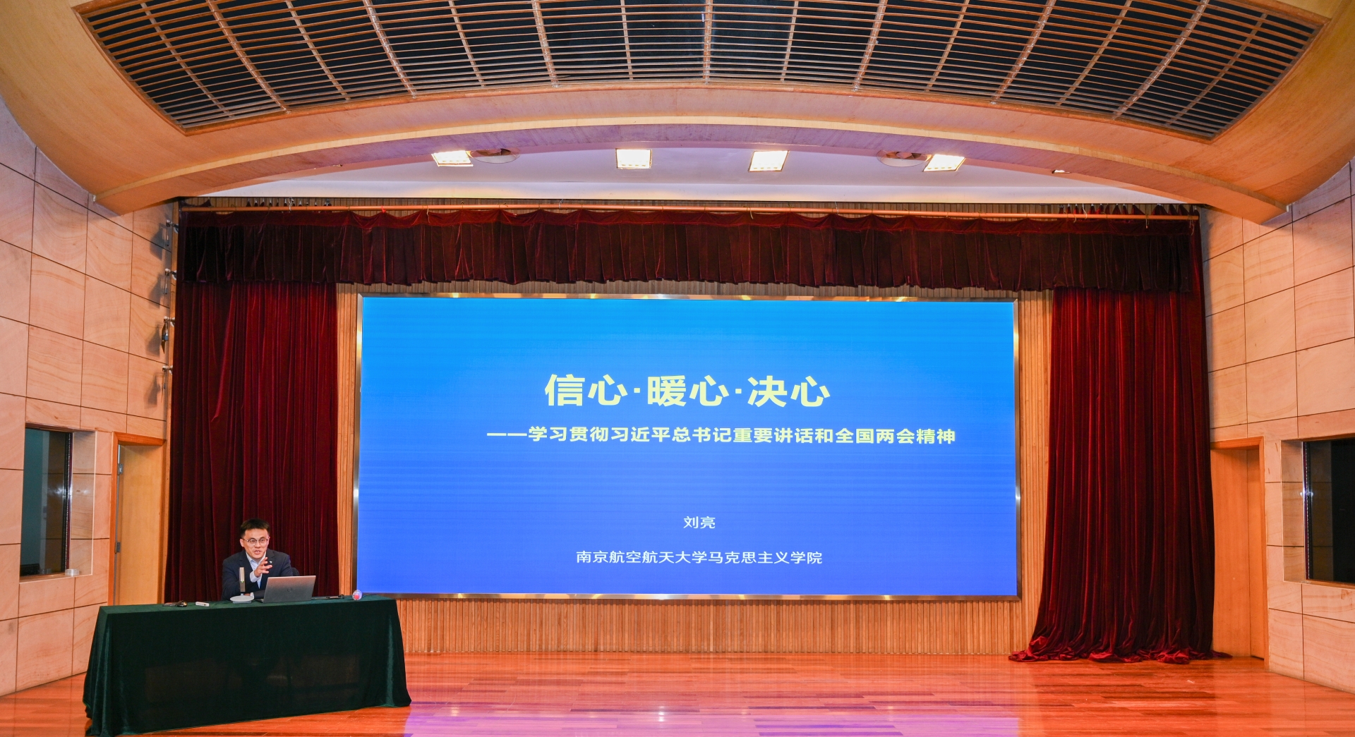 为深入学习贯彻2025年全国两会精神,引领大学生把握新时代党和国家事业发展的新部署、新要求,进一步提升青年学生的思想政治素养,3月20日下午,av在线 团委在报告厅举办学习全国两会精神专题培训会。江苏团省委青年讲师团成员、南京航空航天大学马克思主义学院副教授刘亮老师以“学习贯彻习近平总书记重要讲话和全国两会精神”为主题做专题授课,院系专兼职团干部、第十四期青马工程培训班学员、2025年春季学期入团积极分子共240余人参加了本次培训会。
