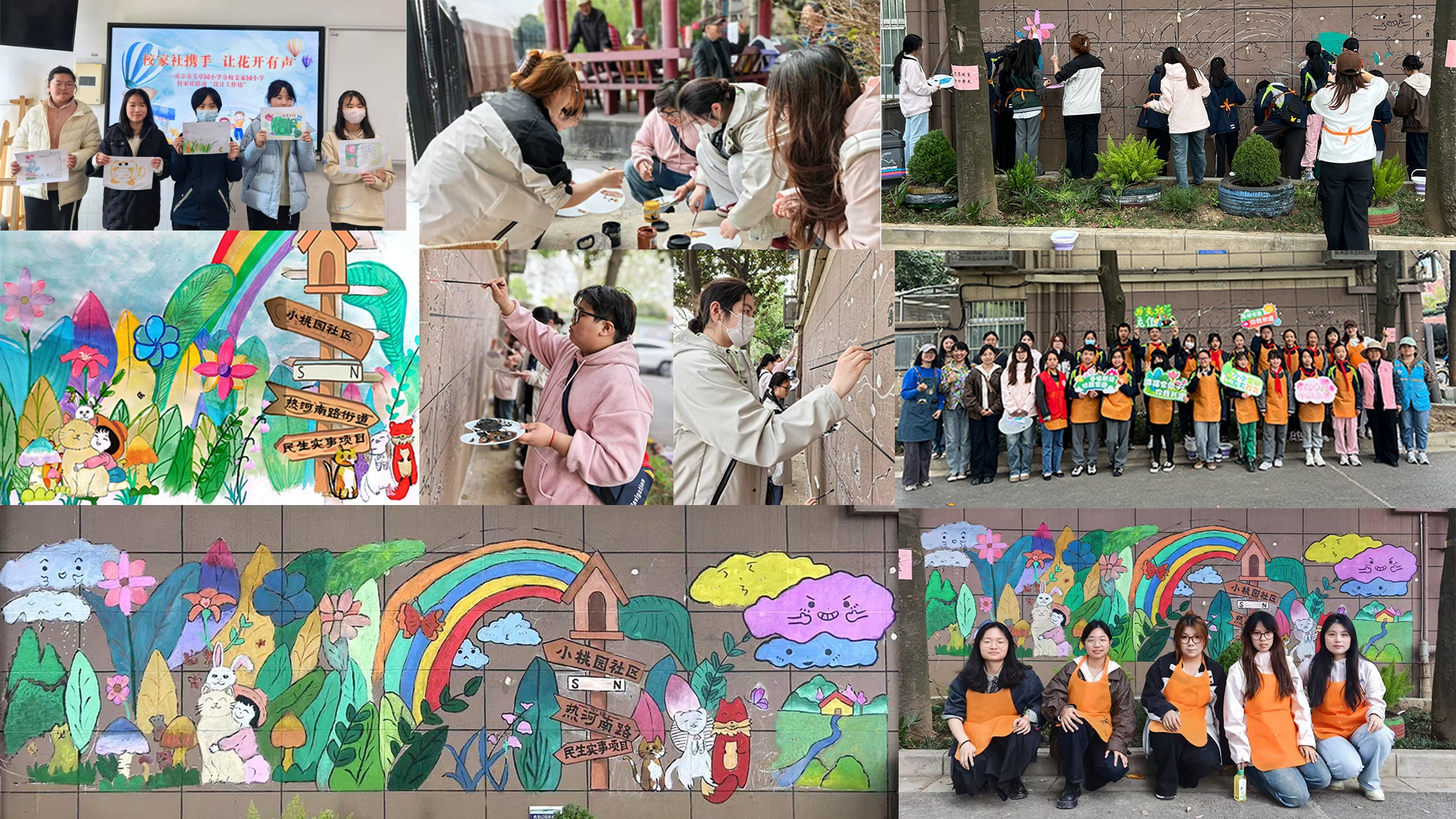 3月23日,春色盎然小桃园社区,一面斑驳的老墙正在经历"蜕变"。党员教师徐嘉嘉带领五名学生,以 “幸福家园,携手共建”为主题进行墙绘创作。这次的墙绘项目是由南京朴育公司的设计师带领姜家园小学的同学们手绘出草图,由我系数媒专业的同学用软件拼接设计、精细调整,再到社区现场画出黑白线稿,最后带领孩子们上色、美化。活动过程中,生态科技公司、社区、小学、高校四方通力合作,互相支持,这让活动既有意义,又实现了多方共赢。