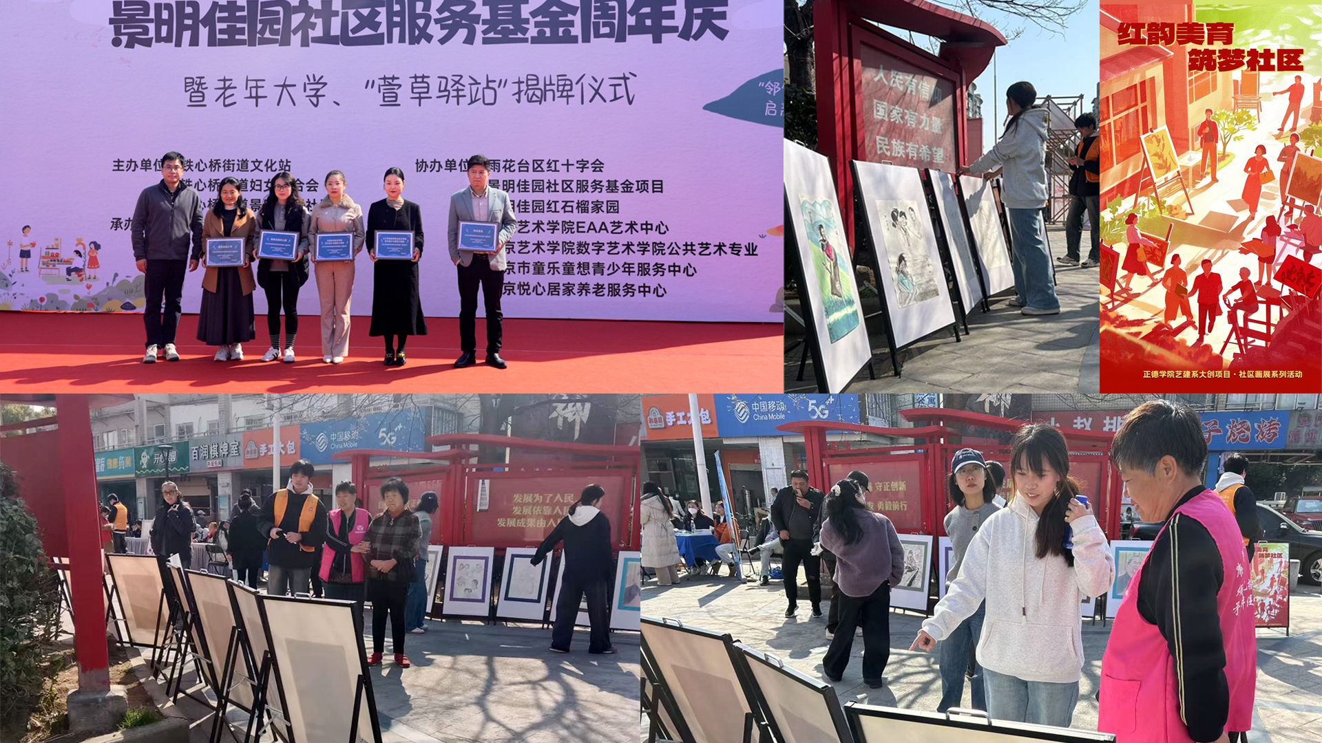 3月20日,景明佳园社区服务基金周年庆暨老年大学、“萱草驿站”揭牌仪式现场,一场特殊的画展也同步呈现在社区居民们面前:广场两旁的落地展架上,以“平凡人心中的祖国之美”为主题的绘画作品一经亮相,就引得居民连连称赞。此次社区快闪画展是由艺建系大创团队精心策划布置,所有作品均在南京普通市民中征集而来。画展以“红韵美育、筑梦社区”为主题,让普通人用纸笔歌颂心中的祖国与人民,显得尤为动人。