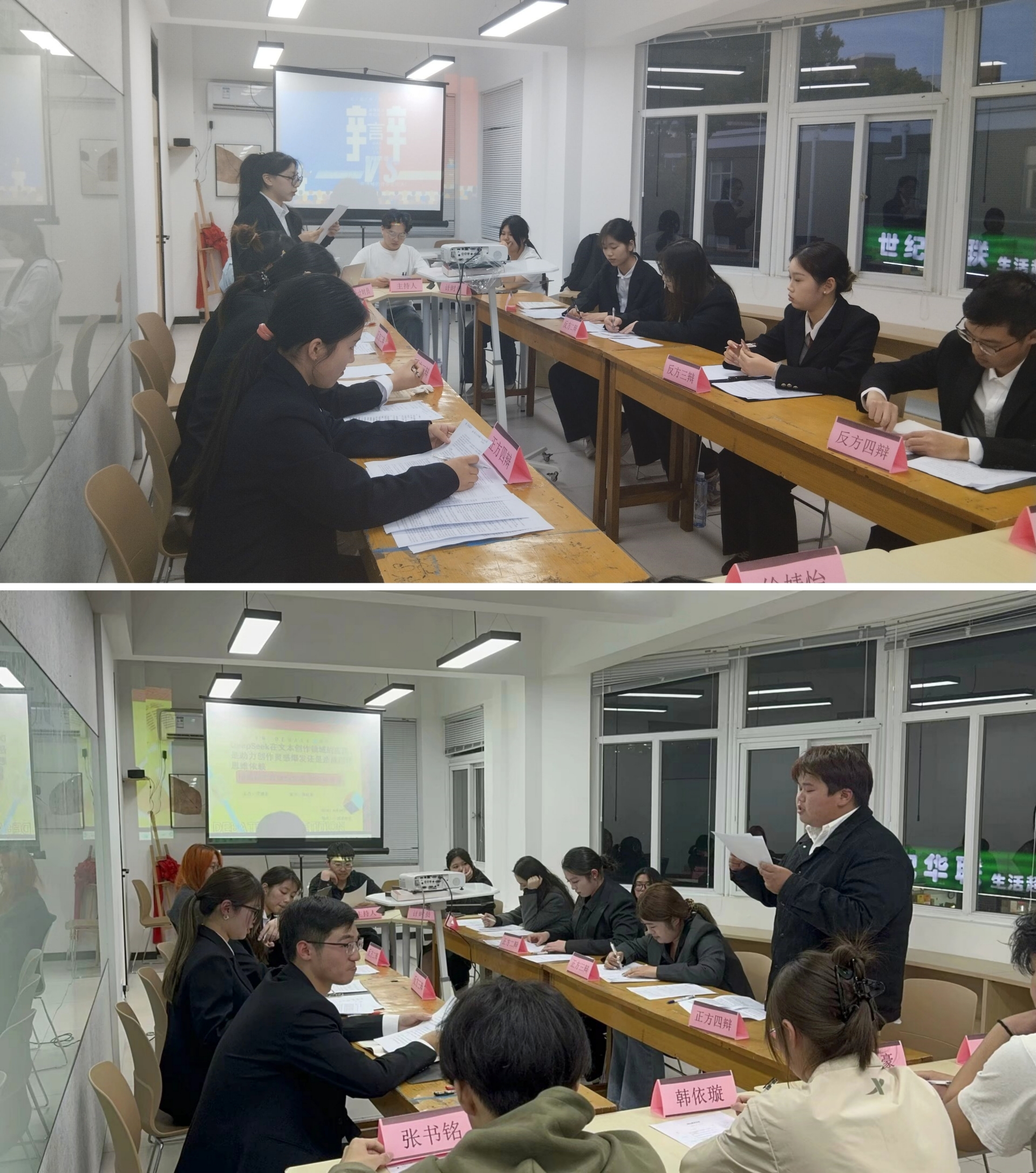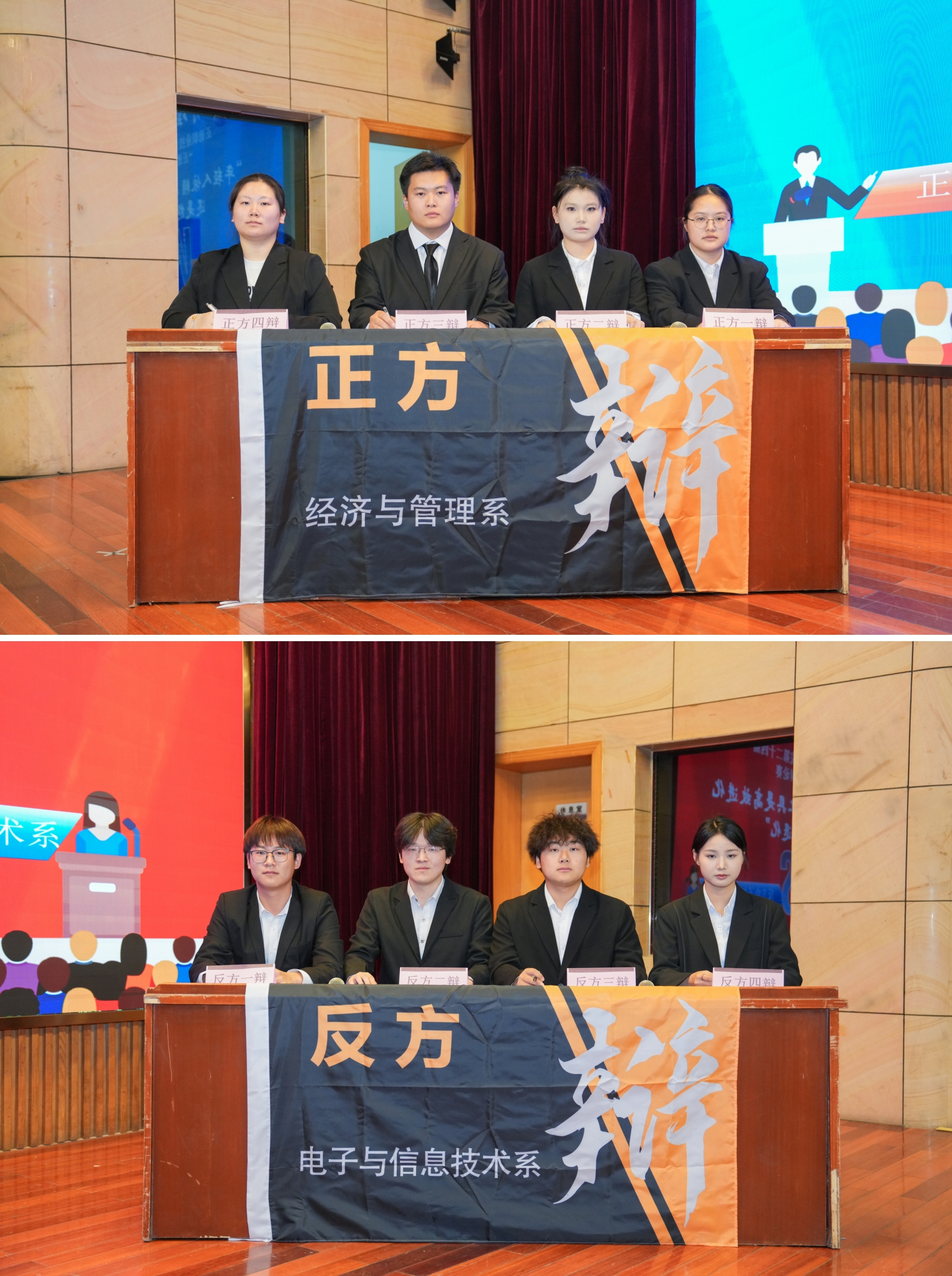 本届辩论赛分初赛、复赛、决赛,实行淘汰赛制,共六支队伍参加。辩题紧扣当下热点话题,各系学生同场论辩、同台竞技,思想碰撞,火花四溢。经过前期在一站式社区进行的比赛,电子与信息技术系和经济与管理系两支队伍的优秀辩手们脱颖而出,在决赛的舞台上进行了一场激烈的交锋。双方辩手针对辩题“年轻人依赖AI工具是高效进化还是能力退化”展开激烈辩论,围绕论点、引经据典、妙语连珠、旁征博引,现场气氛热烈而紧张。