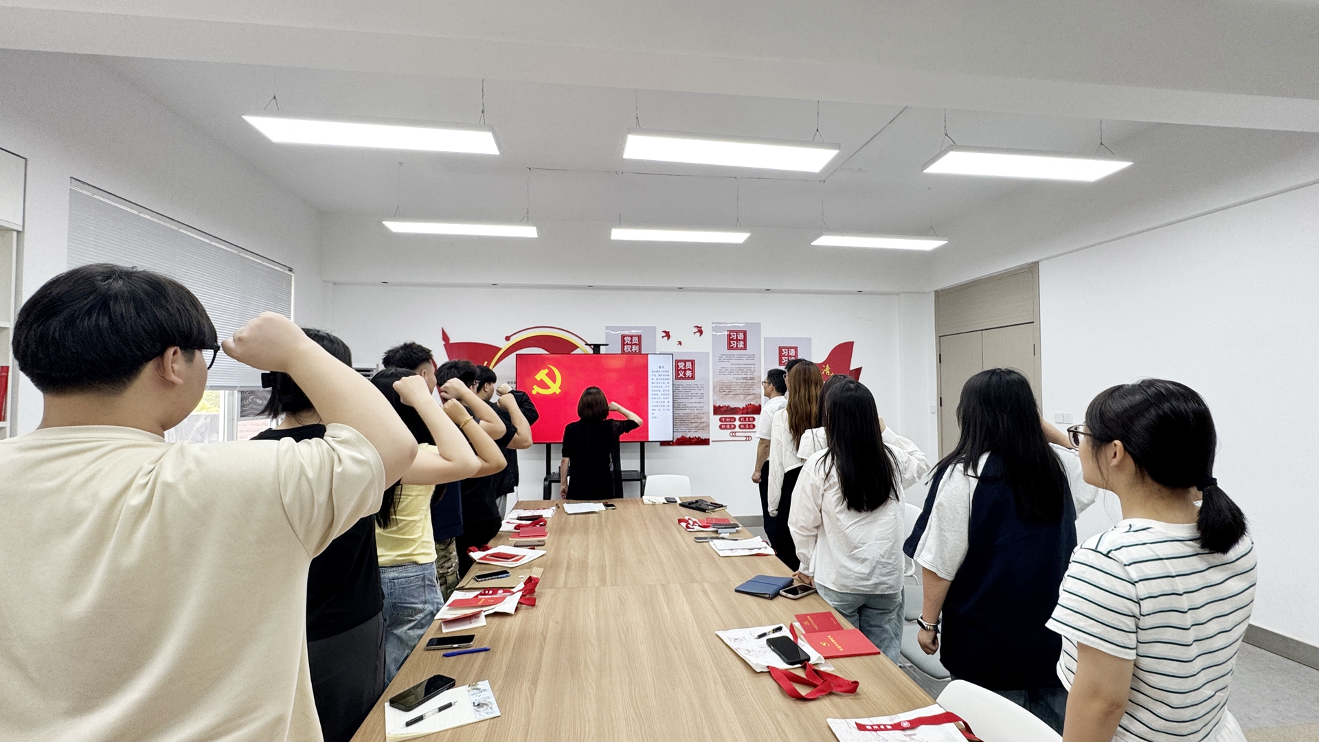 最后,全体毕业生党员在党支部书记的带领下,重温了入党誓词。铿锵有力的誓言回荡在会议室,它不仅是他们学生时代的句号,更是他们终身践行的承诺。