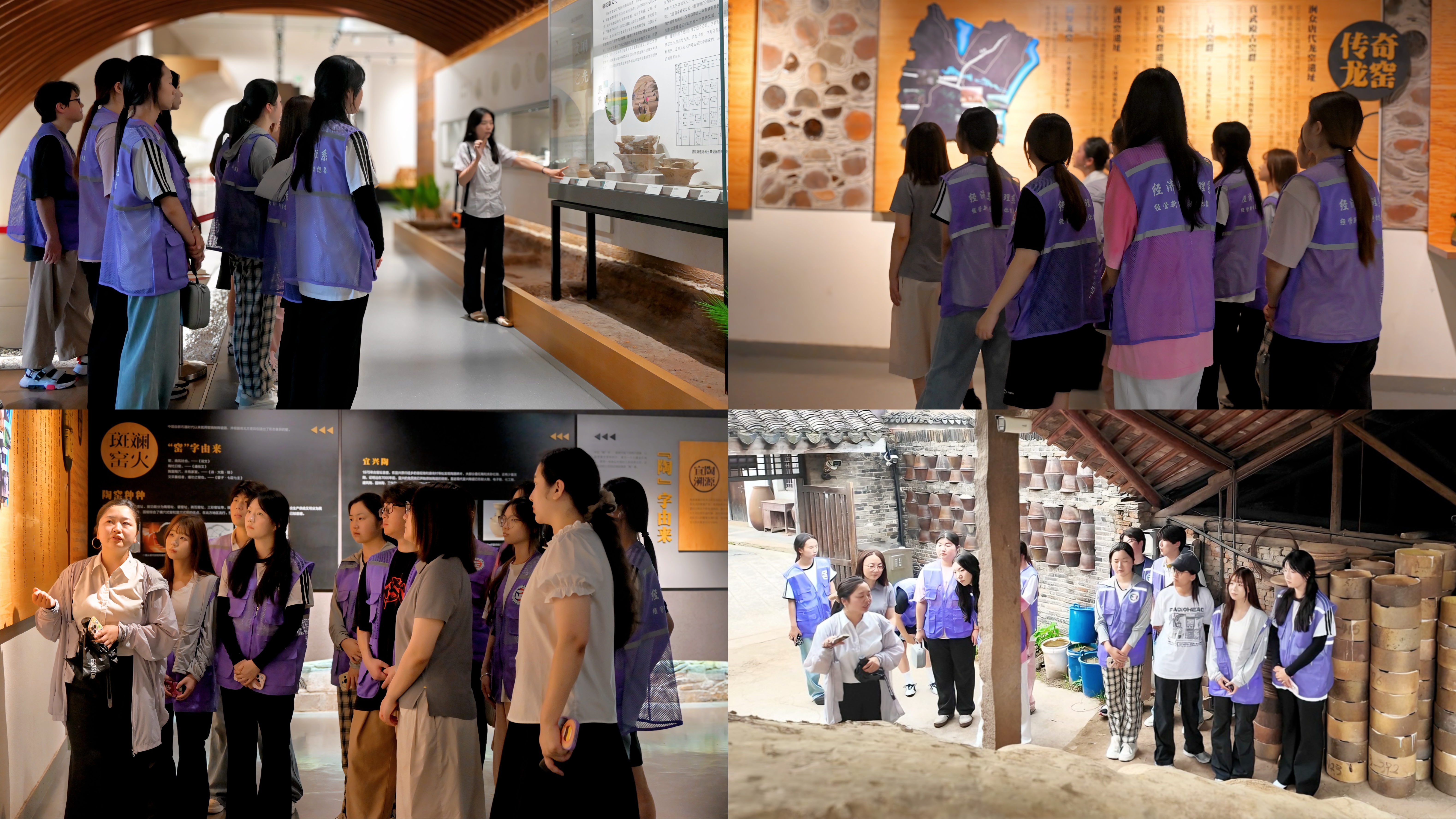 实践团队第一站来到中国宜兴陶瓷博物馆。通过讲解员的介绍,大家了解到紫砂壶从东汉原陶演进至明清鼎盛的千年技艺流变过程,透过展陈的历代名壶与泥料样本,感受非遗文化的博大精深与陶艺工匠的智慧巧思。在随后参观的全国重点文物保护单位前墅古龙窑中,师生们在工作人员的讲解以及实地观摩古法柴烧工艺的遗迹与模型中,了解了火道设计、进柴顺序、温控技巧等技术原理。大家纷纷惊叹于古人的劳动智慧,更是深感文化传承背后的不易。