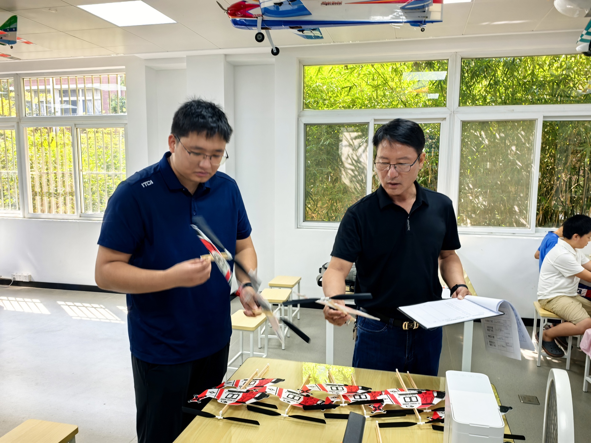 飞行测试现场,考生们屏息凝神,待监考老师发出指令后,精准抛出手中的模型。纸飞机在空中划出优美弧线,橡筋动力模型飞机则借助橡筋的弹力持续升空,监考老师手持计时器与测距工具,认真记录每一次飞行的时间与距离,确保评分公正准确。