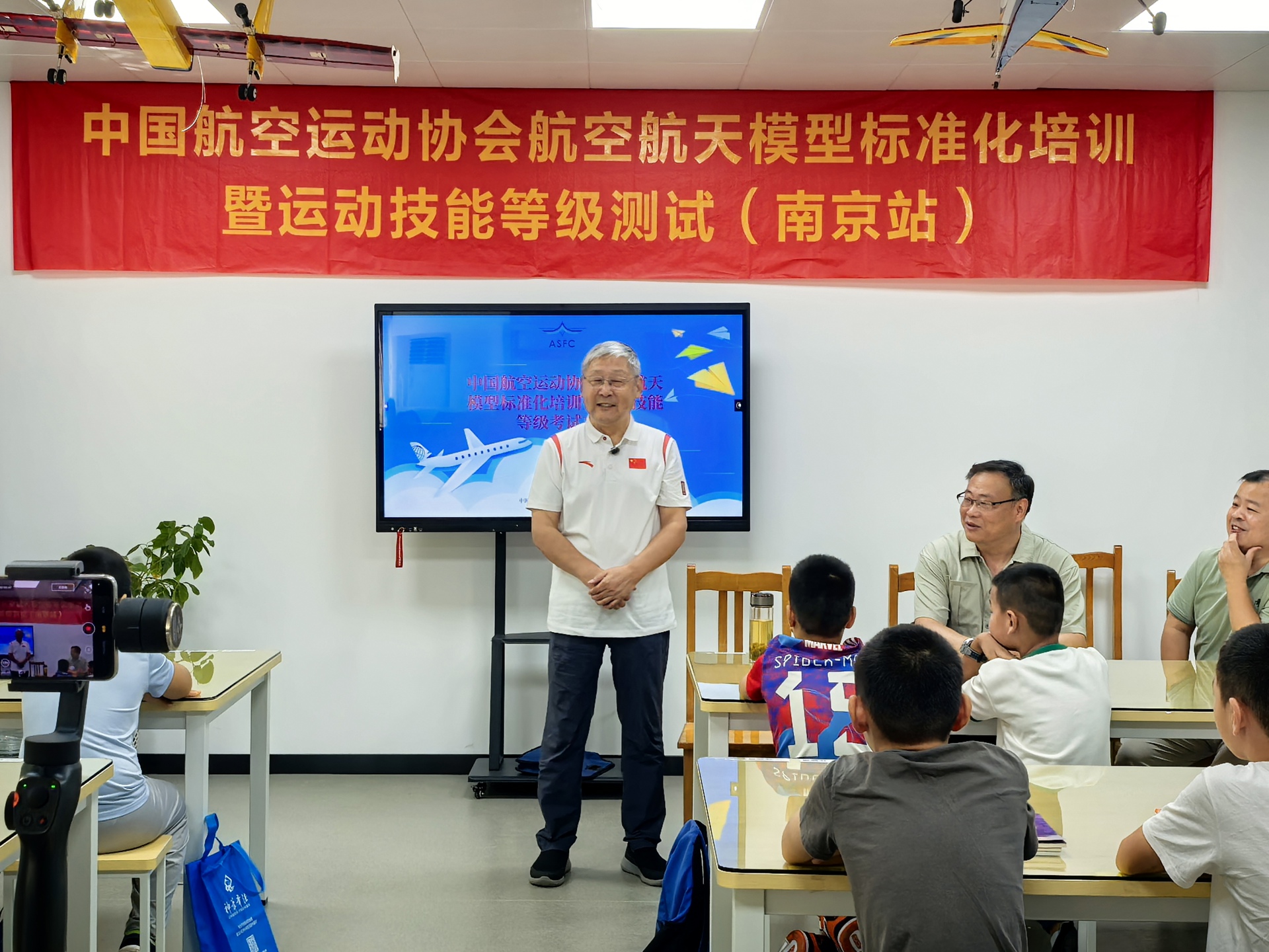 近日,中国航空运动协会航空航天模型标准化培训暨运动技能1-3级测试(南京站)考级工作在av在线 圆满落幕。首批共12名学员参加了本次考级。江苏省航空运动协会秘书长王剑、办公室主任曹佳诚,南京市江宁区教育局体卫艺科副科长张铭莅临现场指导并担任现场裁判。