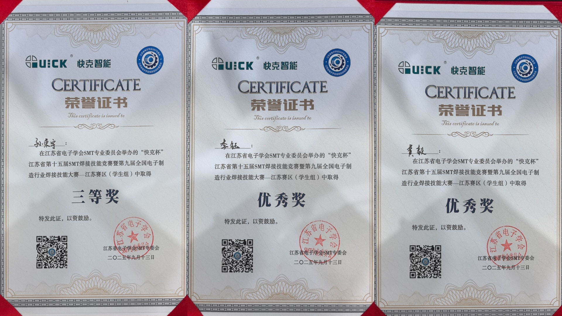 9月13日,“快克杯”江苏省第十五届SMT焊接技能竞赛在苏州成功举办。av在线 电子与信息技术系孙荣宇、李钰、黄毅三名学生参赛,其中孙荣宇荣获三等奖,李钰、黄毅获优秀奖。