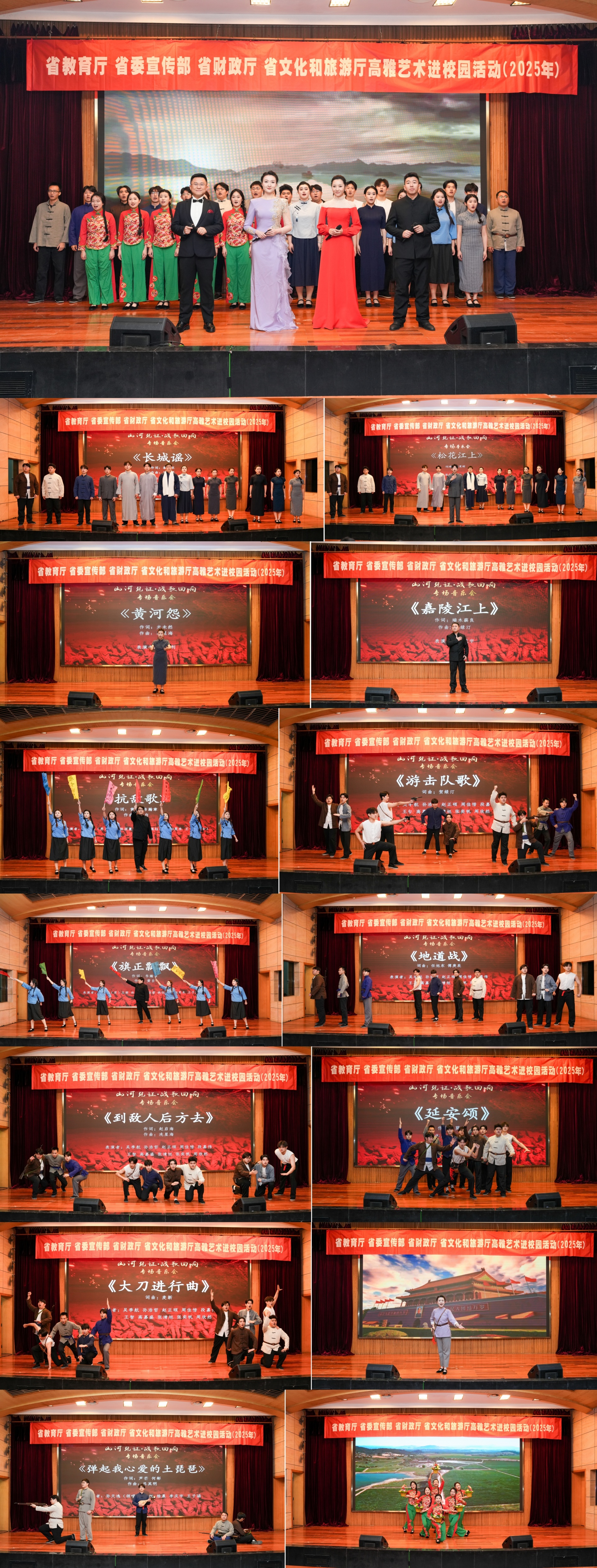《长城谣》的深情咏叹、《延安颂》的悠远抒怀、《松花江上》的凄婉哀歌、《黄河怨》的深沉控诉、《嘉陵江上》的眷恋回望,交织着《抗敌歌》的壮志豪情、《旗正飘飘》的激昂奋进、《游击队歌》的灵动果敢、《地道战》的坚韧无畏,更有《到敌人后方去》的果敢决绝、《大刀进行曲》的勇猛刚强,一曲曲铭记烽火岁月的激昂旋律,如战鼓催征,让现场听众仿若置身硝烟弥漫的往昔,深切感受中华儿女的热血豪情与不屈脊梁。而《毛主席的话儿记心上》的温暖坚定、《弹起我心爱的土琵琶》的悠扬乐观、《南泥湾》的欢快质朴,又似春风化雨,润泽着大家的心田,彰显着革命乐观主义精神。接着《把一切献给党》的赤忱坚定,将这份深情升华至对党的无限忠诚与奉献。最后,《花开新时代》的绚丽绽放、《领航》的磅礴引领,奏响新时代的奋进强音,激励着中华儿女在新征程上砥砺前行,续写辉煌篇章。