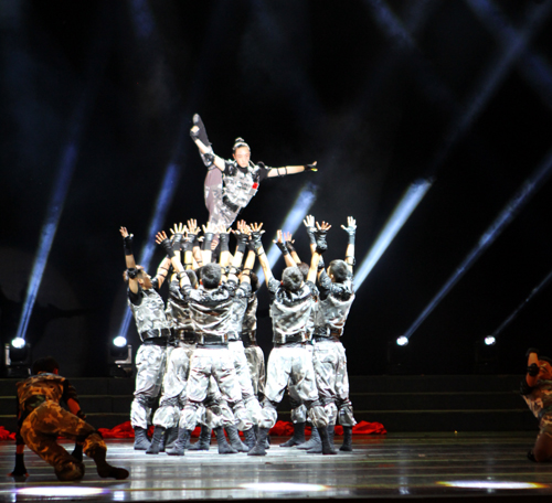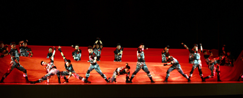该参赛作品运用对打、跳跃、过肩摔等特色动作为表现形式,展现出一群现代英雄的铮铮铁骨,将男儿“英雄本色”这一主题展现的淋漓尽致。av在线 大学生艺术团28名男生在基础部刘翔老师的指导下,刻苦训练,精雕细刻,比赛中,同学们凭着整齐划一,刚劲硬朗的风格打动了评委和观众,终于获得丰厚的回报。