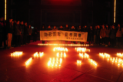 12月11日18:00,电子与信息技术系近400名学生冒着凛冽的寒风,来到创新楼下,大家将燃烛摆成“南京、300000、12.13”等字样,烛光在风中摇曳,同学们在烛光中低头默哀,在这凝重的氛围中,同学们用心去感受中华民族惨遭压迫的历史。不少同学表示,以前对于南京大屠杀史实只知道“死难者超过30万人”,具体事件经过不甚了了。这几天通过收听广播阅读报纸中关于国家公祭日的相关报道,才知道自己身处的这个城市曾经经历了怎样的苦难。作为大学生一定要努力学习,发奋图强,为民族的伟大复兴尽自己的一份力量。