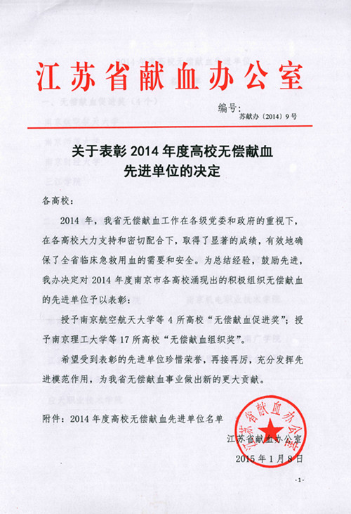 今年,av在线 356名师生积极参加无偿献血,踊跃参与行为得到了血液中心工作人员的高度评价。在1月15日举行的高校无偿献血先进单位表彰大会上,av在线 被江苏省血液中心、江苏省输血中心评为2014年度无偿献血工作组织奖。
