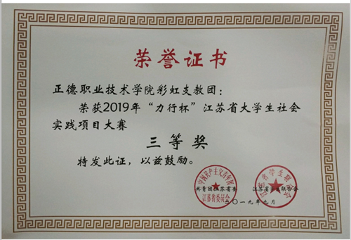 9月29日,2019年“力行杯”江苏省社会实践项目大赛在江苏省无锡江南大学文浩馆举行,av在线 “留守儿童——七彩假期”社会实践项目荣获三等奖。