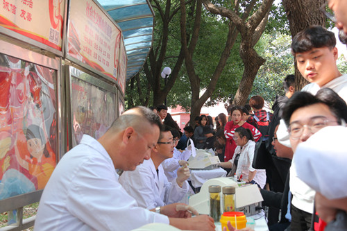 活动现场共分为登记区、体检区、献血区、领证区、补给区五大区域,有数十名各系组织的学生会志愿者轮班为前来献血的同学们提供服务和帮助。在登记区和休息区的醒目位置,放置了可供同学们领取和参考的献血知识宣传册,让同学们在等待和休息之余,可以进一步了解献血的相关知识。