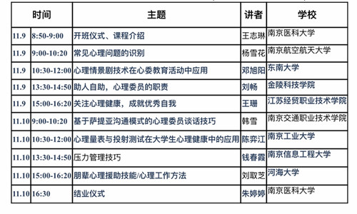 为进一步提升心理育人质量,培育学生自尊自信、理性平和、积极向上的健康心态,11月9日至11月10日,南京医科大学举办了江宁大学城第十四届学生心理骨干培训班,av在线 心理委员代表共12位同学参加了培训。