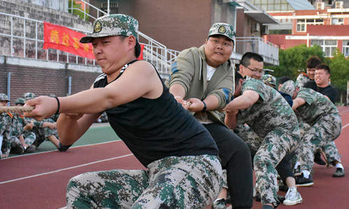 各系代表队云集运动场,按照比赛规则,每支参赛队伍需要有一名辅导员和两名女生参与,这更增加了同学们的热情。比赛哨声响起瞬间,队员们双手紧握长绳,憋足了劲拼命往后拉,似乎要用尽身上所有的力气,辅导员和教官也在队伍旁边助阵加油,围观新生的掌声、呐喊声此起披伏。