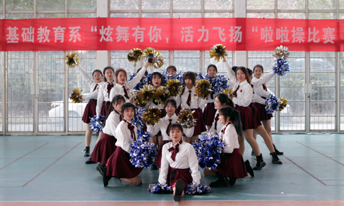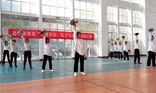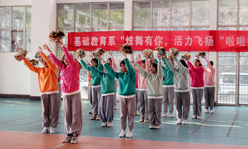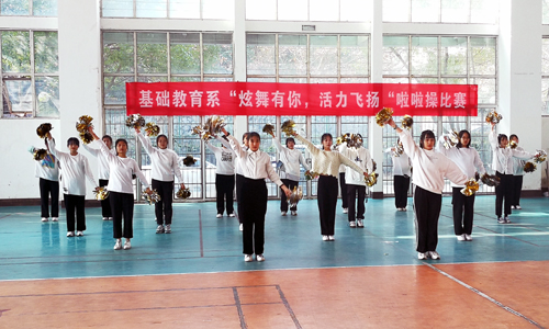 2020年12月28日中午,基础教育系“炫舞有你,活力飞扬”新生啦啦操大赛在运动馆热烈开赛。该系主任詹勇虎,副主任杨卫东来到现场观赛,体育教师杨俊娃、吴彩荣、沈帅、陈海波等担任比赛评委。
