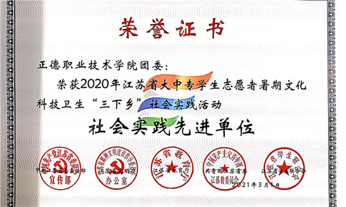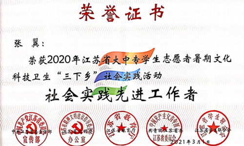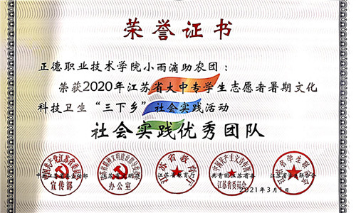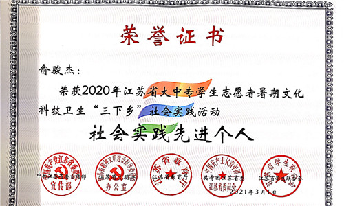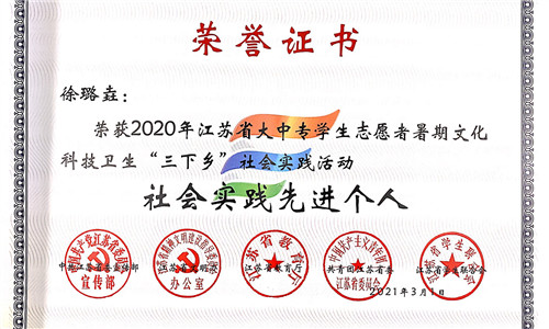 为了进一步推进社会实践活动持续深入开展,根据中共江苏省委宣传部、江苏省文明办、江苏省教育厅、江苏省新闻出版局、共青团江苏省委、江苏省学联联合发文表彰团苏委联【2021】5号《关于表彰2020年全省大中专学生志愿者暑期文化科技卫生“三下乡”社会实践活动先进集体和个人的决定》,院团委荣获江苏省“三下乡”社会实践先进单位,“小雨滴助农团”荣获江苏省“三下乡”社会实践优秀团队,徐璐垚、俞骏杰同学荣获江苏省“三下乡”社会实践先进个人称号、张翼荣获江苏省“三下乡”社会实践先进工作者称号。