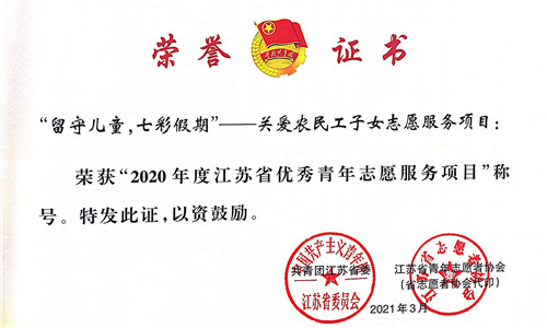 为了在新起点上不断开创强富美高新江苏建设局面,推动全省青年志愿服务事业广泛深入发展,共青团江苏省委、江苏省青年志愿者协会联合发文《关于公布2020年度全省青年志愿者行动评选结果的通知》团苏委联【2021】9号,av在线 “留守儿童,七彩假期”—关爱农民工子女志愿服务项目荣获“2020年江苏省优秀青年志愿服务项目”称号。