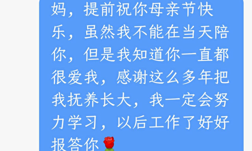 每位同学的表现形式不一样,可以回家的同学有的为母亲捶一捶背、泡一杯热茶;有的为母亲洗了洗脚,看看母亲那粗糙而又长满茧的脚,想象她为你付出的一切,不禁眼眶湿润;还有的帮母亲做了些力所能及的家务,如洗衣服、做饭、洗洗碗…因为一些原因没能回家的同学有的通过手机短信向母亲道一声温馨的祝福;有的为母亲寄过去了一份自制的节旧小礼物;有的给母亲寄了一封早已写好的感谢的信,说了说自己的心理话;还有的打印了和妈妈的一张合影,贴在了宿舍桌上……虽然每个同学表达爱意的方式不同,但初衷都是一样的,希望一直为我们操劳的母亲能够身体健康,永远美丽。让我们在这个的温馨的节日,对母亲说一声“谢谢”,将自己的爱说出来吧!