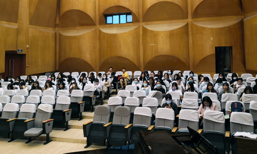 同学们早早来到音乐厅等候演出开始