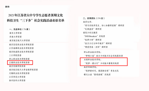 为进一步推进社会实践活动持续深入开展,根据中共江苏省委宣传部、江苏省文明办、江苏省教育厅、江苏省新闻出版局、共青团江苏省委、江苏省学联联合发文《关于公布2021年全省大中专学生志愿者暑期文化科技卫生“三下乡”社会实践活动先进集体和个人名单的通知》(团苏委联【2021】30号),院团委荣获江苏省暑期“三下乡”社会实践先进单位,“筑梦·灌云行”乡村振兴暑期实践团荣获江苏省暑期“三下乡”社会实践优秀团队,吕慧汝、李光宇同学荣获江苏省暑期“三下乡”社会实践先进个人称号、崔杰荣获江苏省暑期“三下乡”社会实践先进工作者称号,陈琪同学的《挖掘乡村文化,助推乡村振兴》荣获江苏省暑期“三下乡”社会实践优秀调研报告。