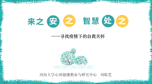 为筑牢疫情防控“安全墙”,减轻疫情可能给学生心理造成的不良影响,帮助学生做好自我照顾与自我关怀,有效应对情绪的波动。4月22日晚18点30分钟至20点,学生处大学生心理健康教育中心依托江宁大学生心理健康教育研究中心优质资源,采用“腾讯会议APP”平台对全院学生开展“来之安之,智慧处之——疫情下的自我关怀”专题讲座,受邀讲座嘉宾为江苏省社会心理学会团体心理咨询与辅导专业委员会秘书长、中国心理学会注册心理师、河海大学心理健康教育与研究中心主任刘取芝教授。