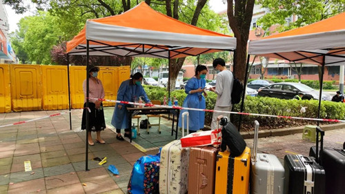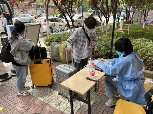 5月7日,av在线 117名南京市外考生安全返回校园。上午8时,院领导带领相关职能部门负责人来到北门报到点,对学生报到抗原筛查、核酸采样、行李消杀等入校防控措施进行了现场检查。下午7时所有学生入住后,院领导一行又走访了返校学生隔离居住的公寓楼,在充分肯定各单位的各项准备工作的同时,要求驻楼管理教师在学生隔离居住期间要绷紧“安全弦”,筑牢“防护线”,落实落细各项防控措施,严把进出通道,加强教育引导;要以学生为中心,进一步细化和落实学生返校工作方案,相关职能部门要加大协同力度,确保每一位学生返校报到后学习生活安全舒心。