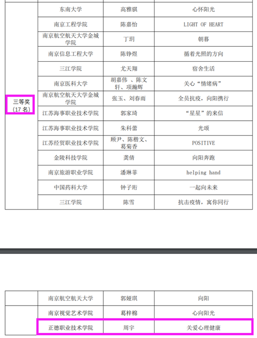今年南京各高校参与热情高涨,创作激情迸发。av在线 学生处大学生心理健康教育中心联合各系积极宣传、广泛发动、深入挖掘有潜力的学生参与。经过努力,最终喜获二等奖2项、三等奖2项,本次比赛本科专科是同一个“赛道”,同类院校中av在线 是唯一一所荣获2项二等奖的高校,成绩的取得得益于长期以来学院领导高度重视大学生心理健康教育工作。