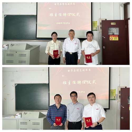 为进一步提高班级管理水平,明确班主任的工作职责,电子与信息技术系2022级新生班主任聘任仪式于9月29日中午在6206教室隆重举行,电信系主任王高山、党支部书记赵欣、受聘班主任和2022级辅导员参加仪式。