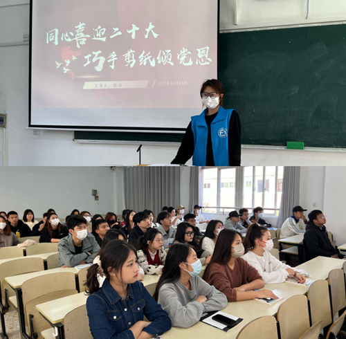 在剪纸现场,先由青年宣讲团成员张琦向同学们讲述二十大召开的重要意义。党的二十大,是我们党进入全面建设社会主义现代化国家、向第二个百年奋斗目标进军新征程中召开的一次十分重要的大会。作为新时代的青年,应怀揣理想,富有使命,满怀自信在理想的土壤中扎根发芽,茁壮成长,成为国家的栋梁之材。