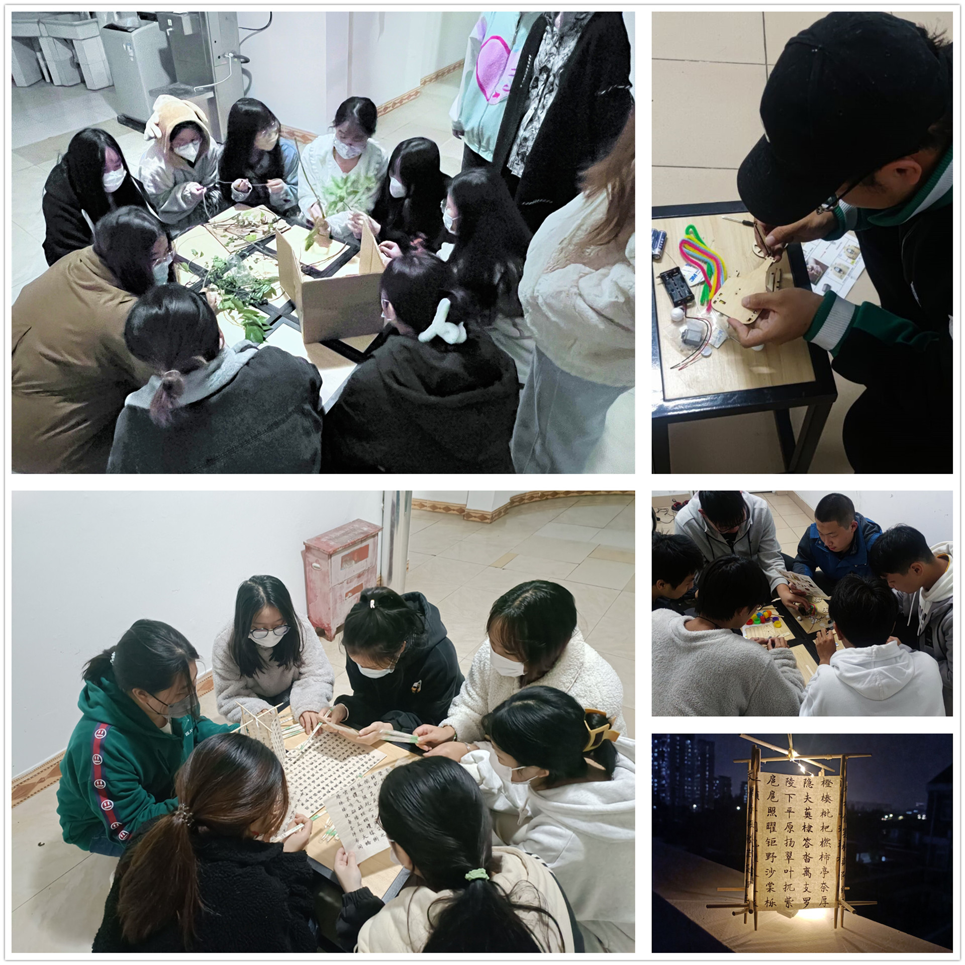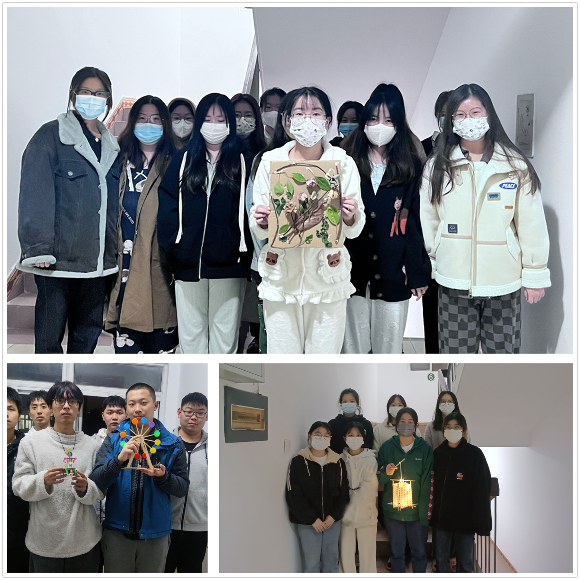 本次活动以团队合作的形式举行,电信系男生、女生分别利用废弃硬纸板、矿泉水瓶盖以及收集的树叶树枝、一次性筷子等制作手工作品。女生团队主要利用废弃的快递纸盒和树叶树枝干花制作装饰画,一次性筷子和书法作品制作筷子灯笼,大家集中智慧进行各种创意,一方面解决了废品处理困难的问题,一方面使宿舍装饰得更显美观。她们相互合作,与团队成员共同完成了一件件手工作品。男生团队则利用矿泉水瓶盖和废弃木板制作“迷你摩天轮”,他们充分发挥自己的动手能力和智慧头脑,剪裁、组装最终完成作品,制作过程中他们相互配合、各司其职,引来了许多同学的围观。