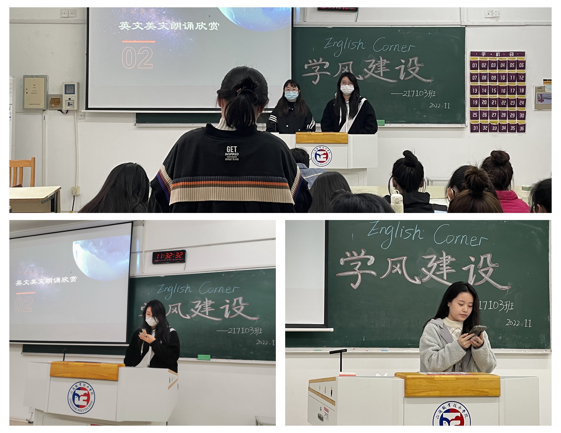 活动第二个部分是英文美文朗诵,三位选手包芸菲、徐旖恬、张竞文同学给大家带来了精彩的英文美文朗诵,一口流利的英文,加上声情并茂的朗诵,不禁让大家赞口不绝,掌声连连。大家在聆听美文的同时也在汲取其中的知识养分,磨练自己的听力。
