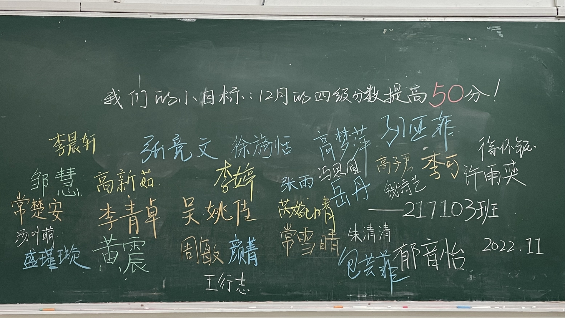 活动最后,辅导员宣读获奖此次竞赛的获奖名单。同时辅导员对同学们提出希望,希望大家能相互鼓励、相互督促,最大限度地调动备考积极性,进一步提高英语四级成绩,备战专转本考试,鼓励同学们要勇于突破自我,积极追求学历提升,提高自身竞争力,在未来的求职就业中更具有竞争优势。并倡议同学们制定了一个小目标:12月份的四级考试每人提高50分!同学们积极响应,纷纷在黑板上留下自己的签名,作为宣誓。
