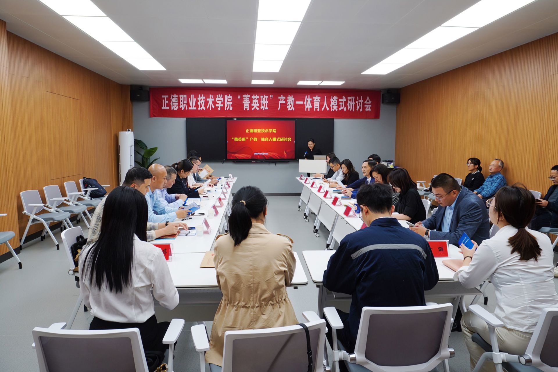 教务处副处长、校企合作办公室主任陆松,教务处副处长张丽娟,分别做《“菁英班”产教一体育人模式的正德探索与实践》《高职院校推动新时代产业工人队伍建设改革的策略研究》专题报告。