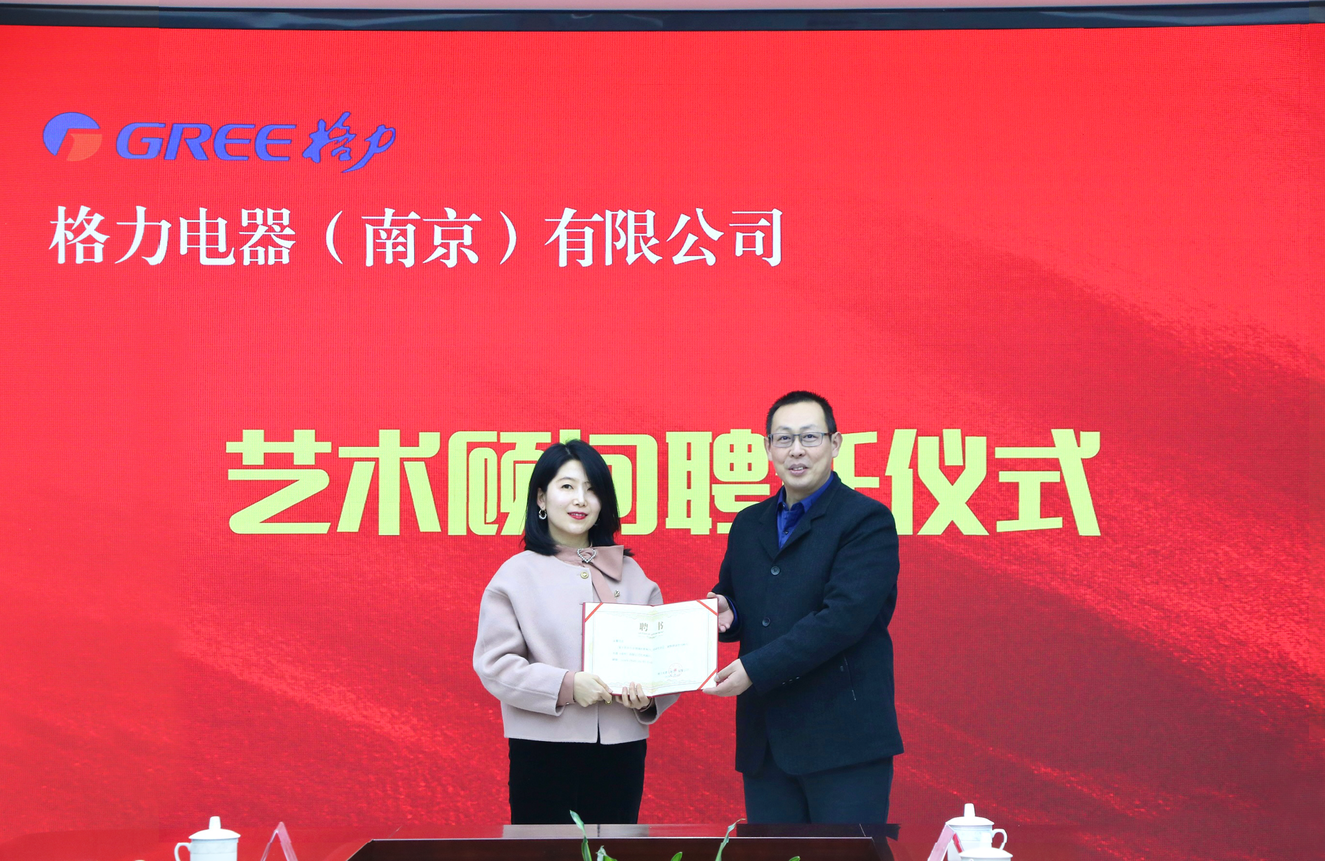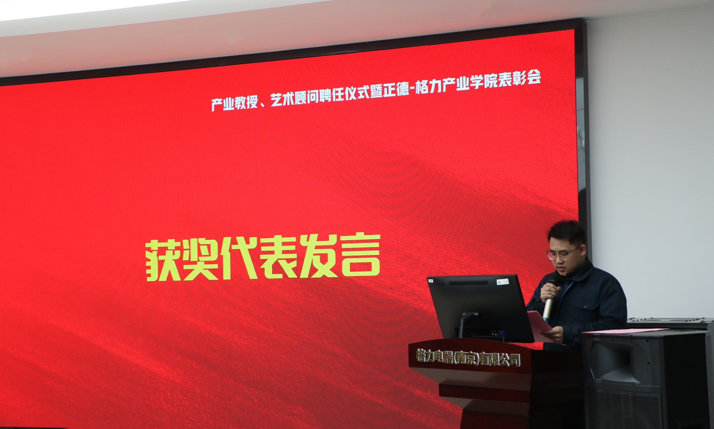 产业教授、艺术顾问聘任仪式暨正德-格力产业学院表彰会伊始,集体观看“正德-格力产业学院两周年专题片”,视频回顾了产业学院两年来的建设和发展历程。为强化“双师型”教师队伍建设,深化企业员工与未来员工融通培养、推动企业高级专家深度参与av在线 专业建设、科学研究、人才培养与教育教学,推动av在线 教师服务企业、深度参与公司艺术活动指导,现场举行了av在线 产业教授聘任仪式和格力电器(南京)有限公司艺术顾问聘任仪式。格力电器(南京)有限公司总经理刘克光受聘担任av在线 产业教授,av在线 教师孟馨受聘担任格力电器(南京)有限公司艺术顾问。