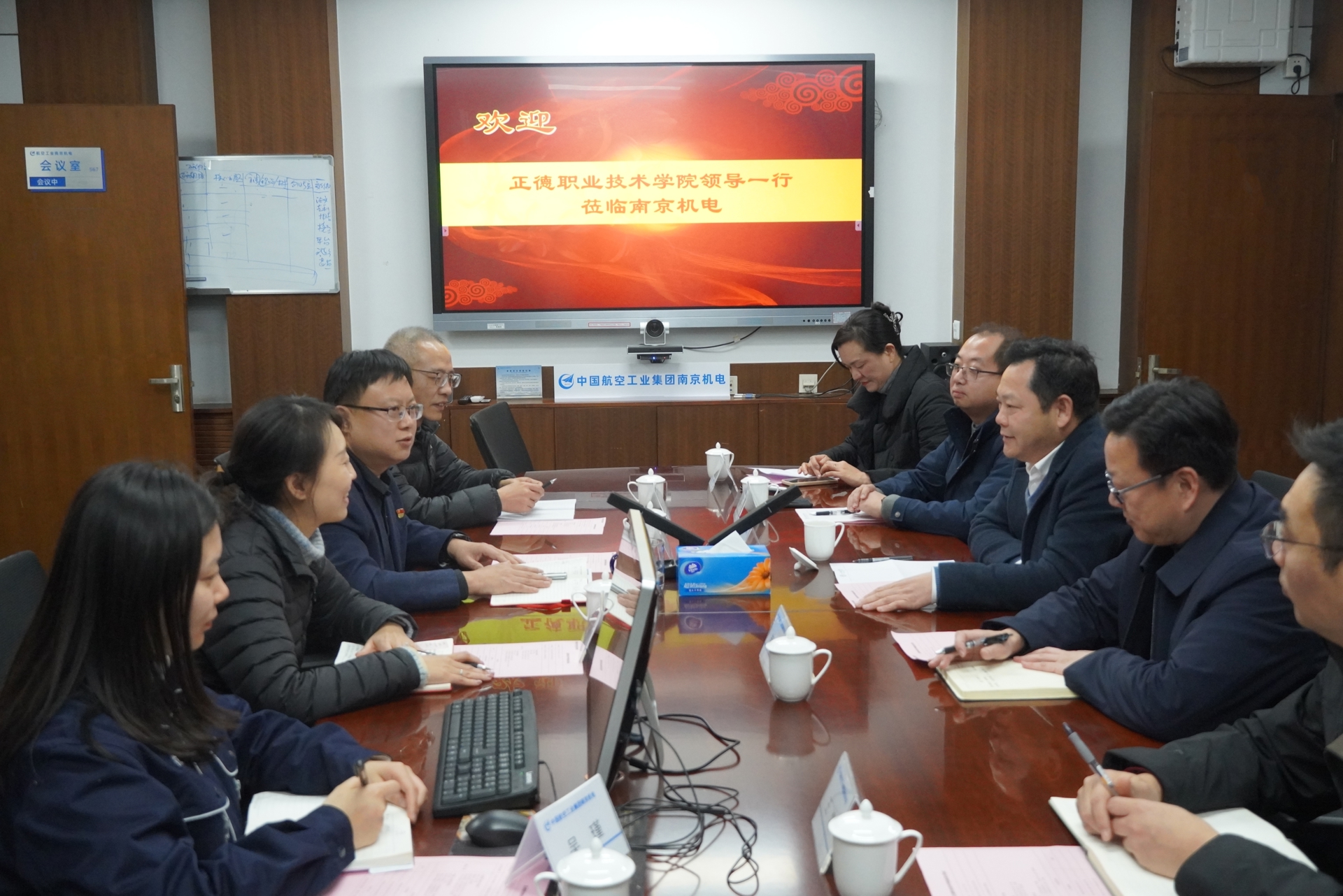 为进一步深化产教融合、精准对接产业需求,加强校企合作,12月27日,院长孙永荣带队赴中航工业南京机电科技有限公司(以下简称“南京机电”)走访交流,南京机电副主任王玉兵,人力资源部部长陈璟,人力资源部副部长、培训中心主任段喜松,av在线 副院长赵凯雷,院长助理、党政办公室主任王伟,院长助理、招生就业处处长王墀以及相关系负责人参加座谈。