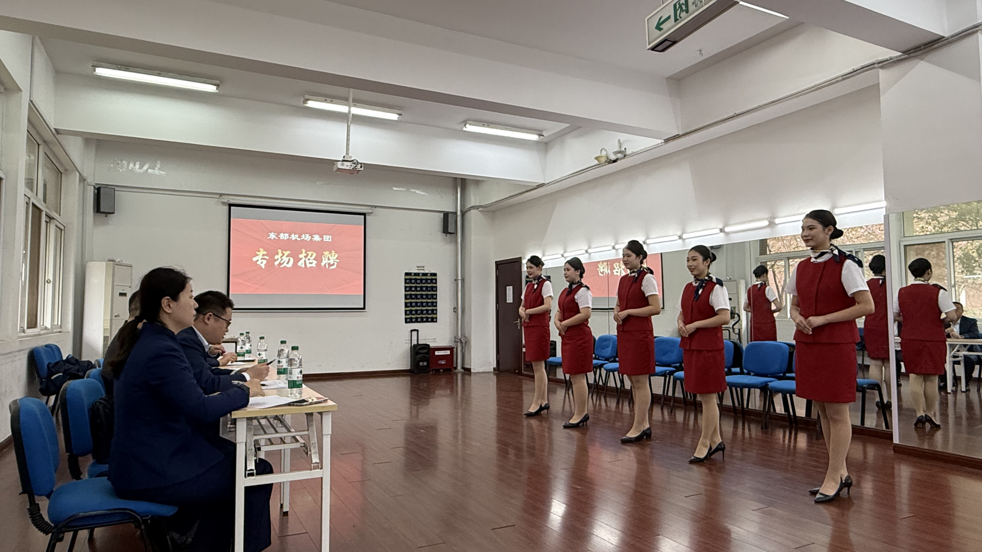 3月27日上午,东部机场集团在民用航空系5109民航实训中心举行了地面服务岗位专场招聘会,为空中乘务专业提供了优质的实习就业机会。