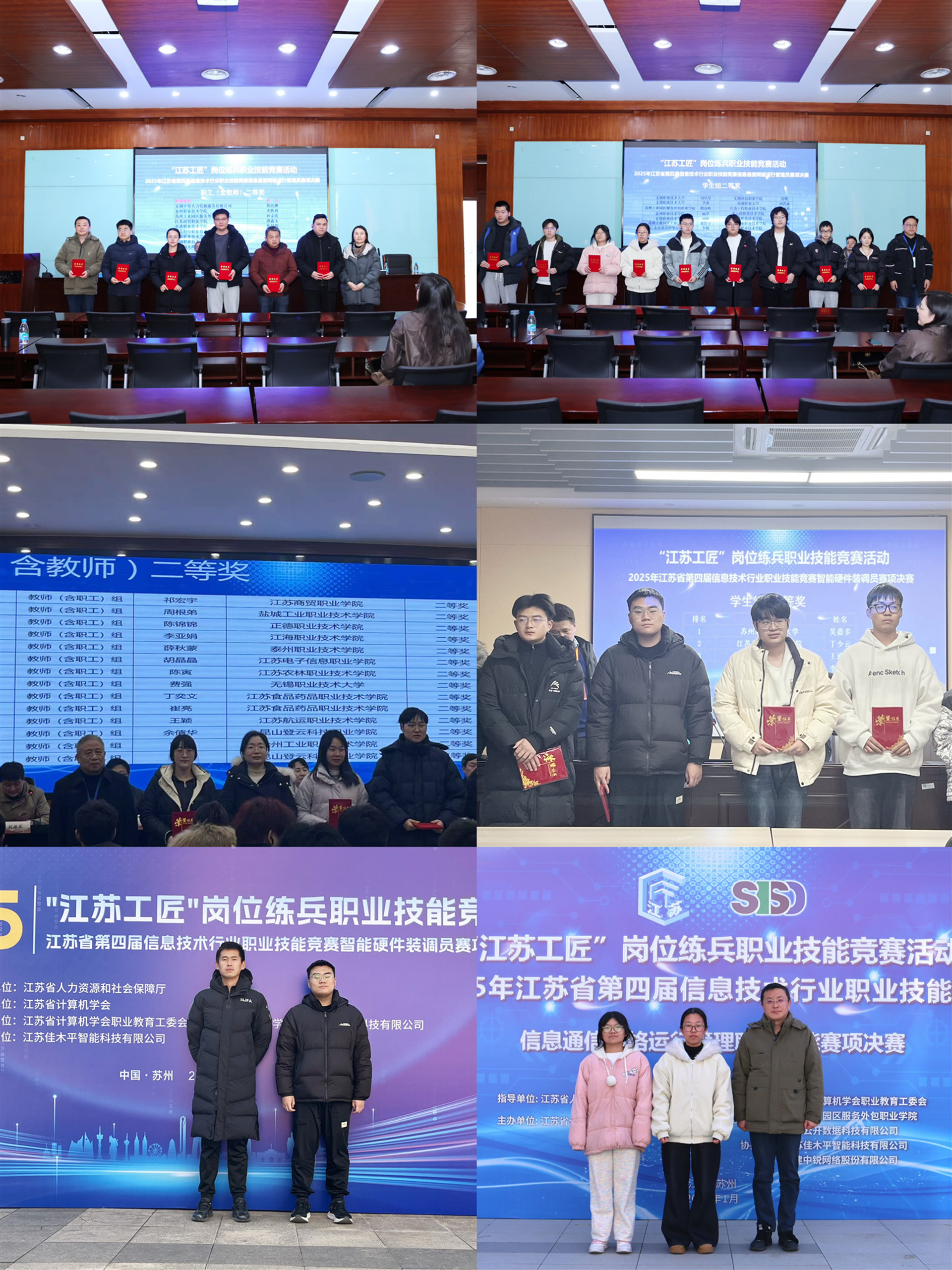 本次大赛由江苏省人力资源和社会保障厅全程指导,属于省级一类竞赛。竞赛分设职工(含教师)组与学生组,均以个人赛形式进行,全面考查选手的理论素养与实际操作能力。此次av在线 电子与信息技术系分别有3名教师和3名学生通过南京市选拔赛脱颖而出,进入本届赛事最终决赛。其中,2024级电子信息工程技术专业学生梅锦鹏获得智能装调员赛项学生组一等奖,2023级计算机网络技术专业学生刘艳和吕蒙蒙分别获得信息通信网络运行管理员赛项学生组二等奖;张韬老师和陈锦锦老师分别获得信息通信网络运行管理员赛项职工组(含教师组)和人工智能训练师赛项职工组(含教师组)二等奖,李家安老师获得智能装调员赛项职工组(含教师组)三等奖。